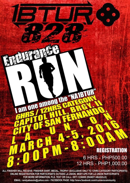 Joining the bandwagon of endurance runs, IBTURIAM presents IBTUR 828 (“828 means 8PM to 8AM endurance run!). This is a 6-hour or 12-hour endurance run along the 3KM loop in “Capitol Hills” that will serve as a qualifying race for IBTUR 160KM and 88KM.