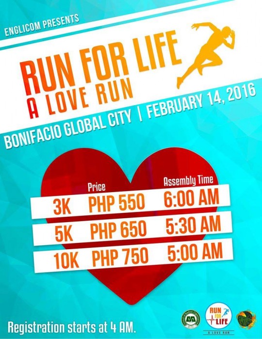 Don’t know what to do this coming Valentine’s day? Well, put your hearts up and spread the love this February 14 at Run For Life : A Love Run. It’s happening in Bonifacio Global City from 4AM onwards! Whether you’re single or in a relationship, you can ‪#‎RuntoForever‬ with your friends, family or lover. There will definitely be something for everyone!