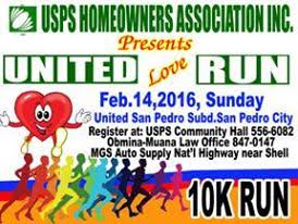 The UNITED LOVE RUN is the 5th USPS 10K FUN RUN organized by the USPS HOMEOWNERS ASSOCIATION INC., United San Pedro Subdivision, City of San Pedro, Laguna. It is happening on FEBRUARY 14, 2016 at 5:00 a.m. It is the much-awaited fun run event in San Pedro. The route consists of flat, uphill and downhill courses. For a minimal registration fee of Php 200.00, each runner will get a dri-fit shirt, race bib, finisher’s medal, loot bag, Jollibee meal and a chance to win in the raffle draw. Major raffle prizes include mountain bikes and Soleus GPS watch. We will award top ten (10) male and female finishers with medals and cash prizes. MAKE IT A DATE!