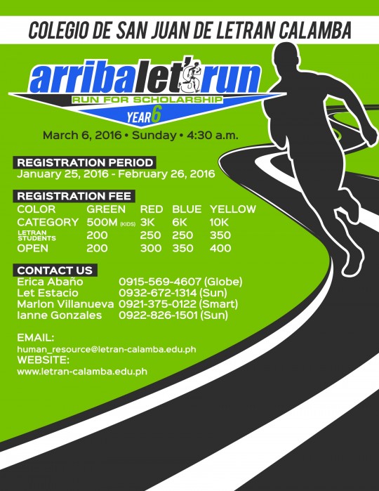 Arriba Let’s Run 2016 : Run for Scholarship 6 is a fundraising event for the benefit of the scholarship program of the Colegio San Juan de Letran – Calamba. It’s happening on March 6, 2016.