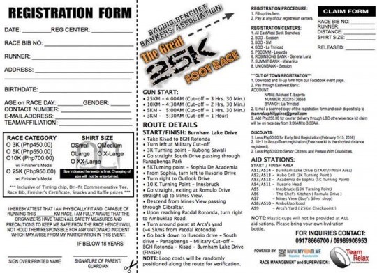 3. Add Php250.00 for courier delivery through LBC otherwise race kit will be claimed on race day from 3:00AM to 3:30AM.