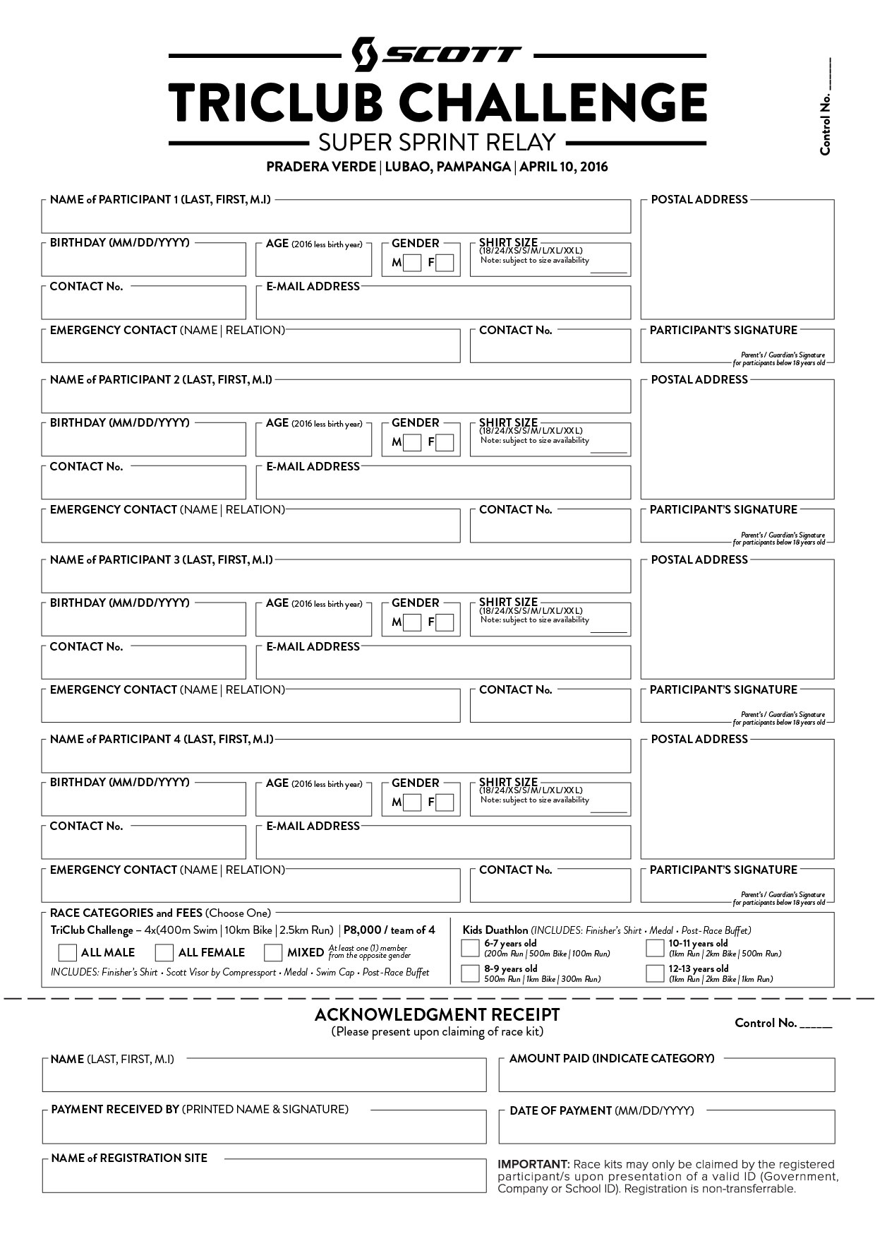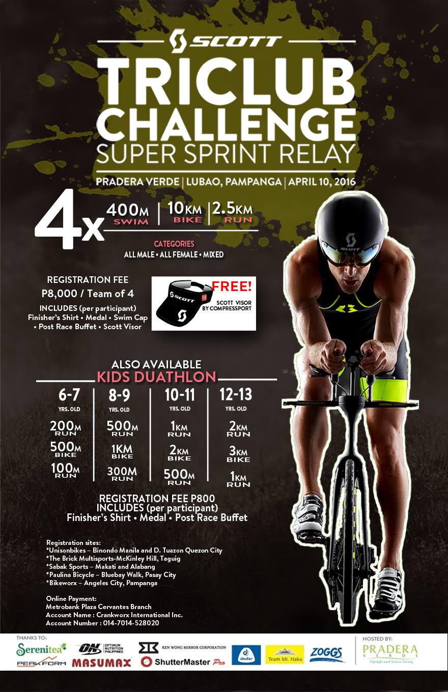 The Scott TriClub Challenge is a triathlon event that takes inspiration from the International Triathlon Union (ITU) format relay event wherein each member of a team of four (4) athletes completes a super sprint distance triathlon one after the other: