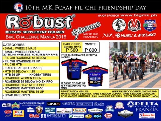Fil Chi Friendship Day Robust Bike Challenge Manila is a Criterium Cycling event from one of the oldest criterium races in the country. This event will have 14 categories, and is happening this May 22, 2016 at Roxas Boulevard.