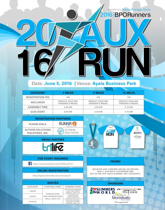 A race that aims encourage to live a healthy lifestyle amongst the professionals in the BPO Industry through running. AUX Run happening in Ayala Business Park, Cebu on June 5, 2016