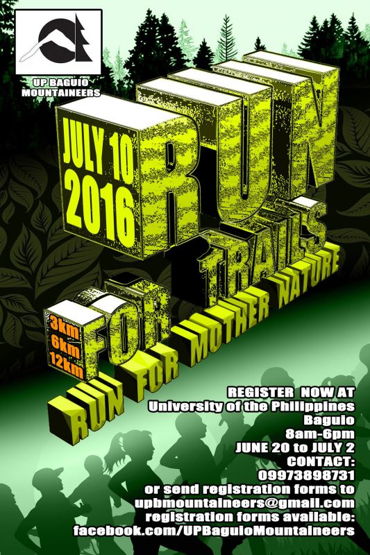 The Run For Trails is an annual event hosted by UP Baguio Mountaineers. This event actively introduces the public to alternative sites for trail running and serves as a stage for environmental advocacy. People of all ages are welcome to join the run which aims to promote environmental consciousness and at the same time enjoy the beauty of nature.