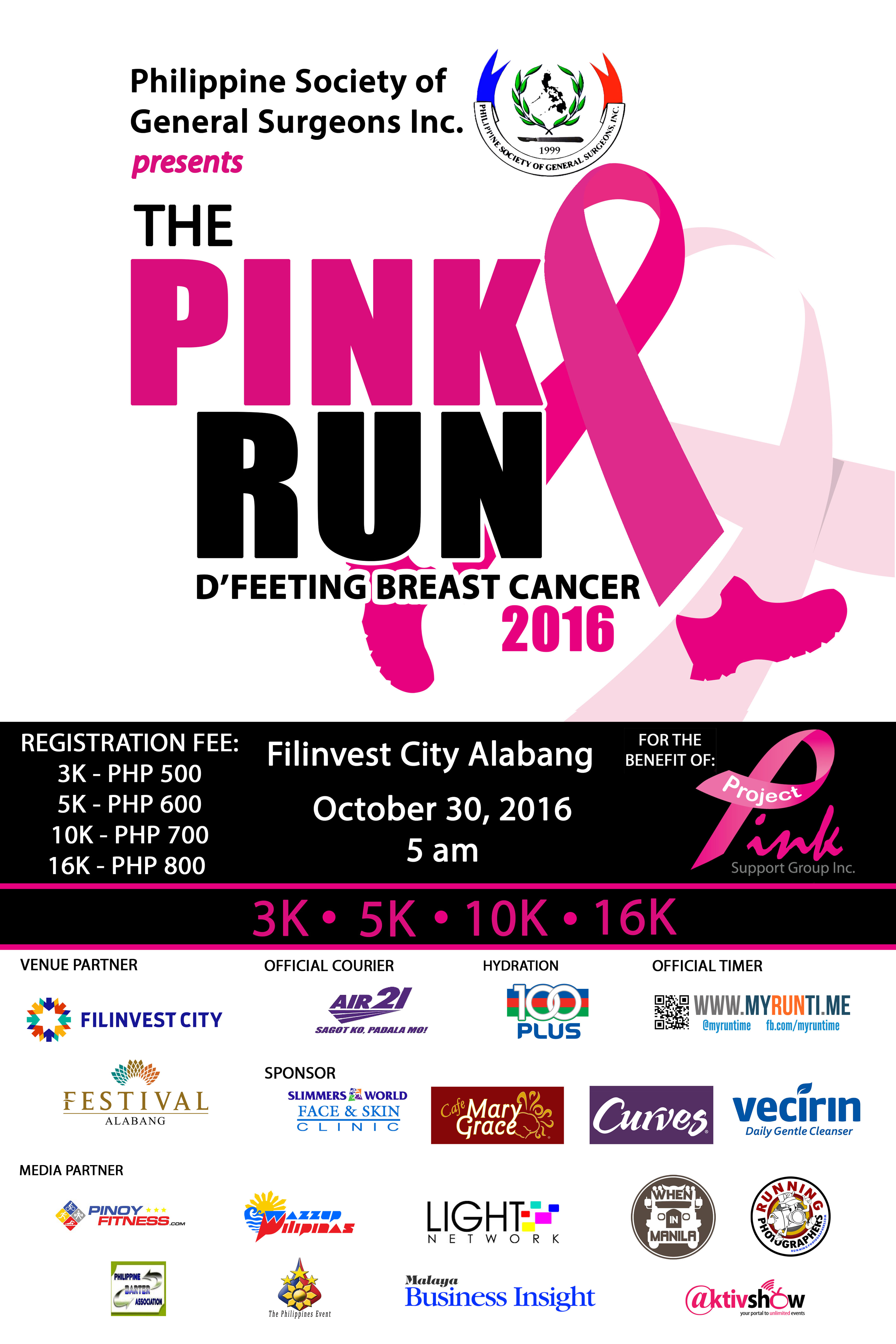 The The Philippine Society of General Surgeons, Inc. (PSGS) is holding a fun run entitled “The Pink Run: D’Feeting Breast Cancer” to be held at the FILINVEST CITY/FESTIVAL MALL ALABANG, MUNTINLUPA CITY on October 30, 2016 (Sunday) at 4:00 am.