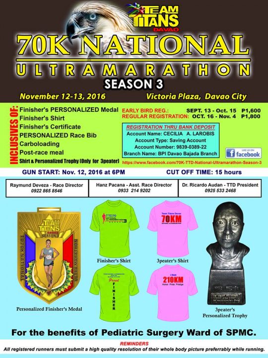 TTD 70K National Ultra Marathon is back on its 3rd year, happening on November 12, 2016 in Victoria Plaza Parking Lot D Bajada Davao City, the race will traverse the 3 district of Davao City with a 15 hrs cut off and the beneficiary of the race will be for the Pediatric Dept. of Southern Philippines Medical Center.