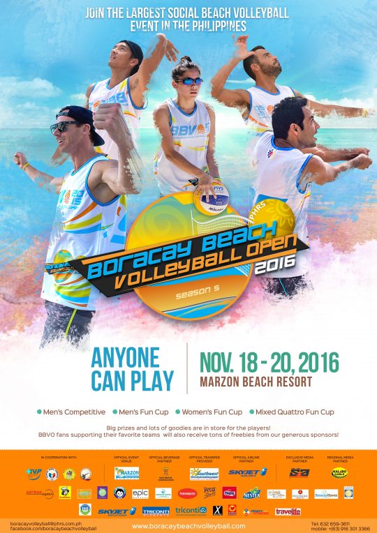 For an updated schedule of events, Players and Fans Packages and listing of all the sponsors please visit www.boracaybeachvolleyball.com. To inquire about Travel Packages you may also call +632 659 3611 and reserve your flights via Skyjet Airlines (BBVO Official Airline Partner) combined with great deals from BBVO partner-hotels to fit all budgets types. – ADV