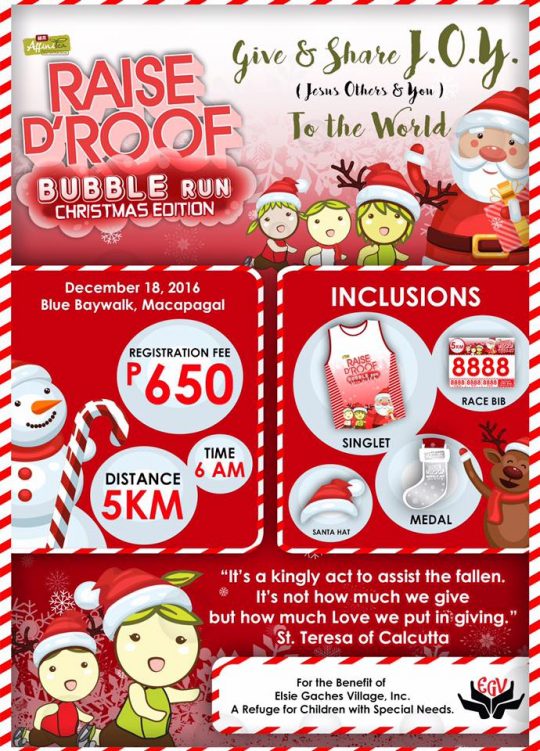 We will be having a special registration for the Raise D’Roof Bubble Run ‘Christmas Edition’ at the CWC Casa y Jardin Bazaar on Oct 29 at Dusit Hotel, Makati