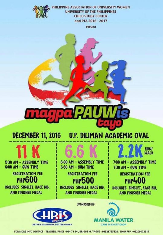 The Philippine Association of University Women, University of the Philippines Child Study Center together with the PTA 2016-2017 presents MagpaPAUWis Tayo 2016 happening on December 11, 2016 at the UP Diliman Academic Oval