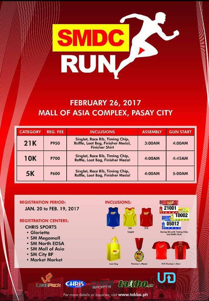 Join SMDC as they host another run happening on February 26, 2017 at the SM Mall of Asia, featuring a 21K, 10K and 5K event distance.