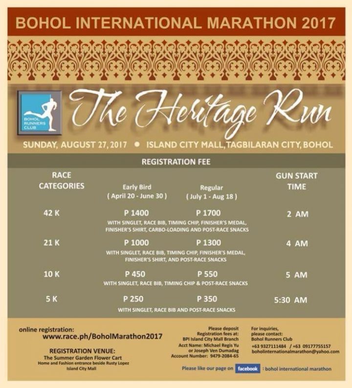 The Bohol International Marathon 2017 “The Heritage Run” is set on August 27, 2017.The race will take runners to Bohol’s magnificent centuries-old churches and historical sites.