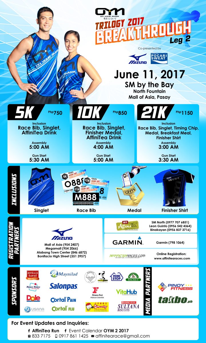 OYM LEG 2 is happening on June 11, 2017 in SM Mall of Asia, SM By the Bay. Featuring a 5K, 10K and 21K distance.