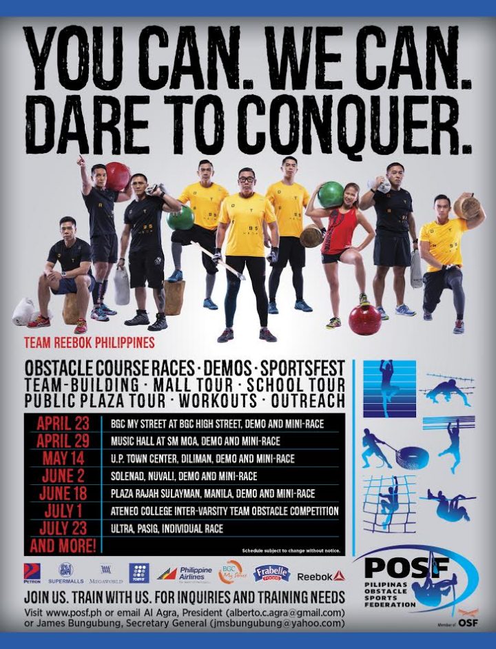 Want to know more about Obstacle Races in the Philippines? Catch one of the upcoming events hosted by the Philippine Obstacle Sports Federation (POSF) together with Team Reebok Philippines! Participate in some demos or try some of the obstacles on your own.