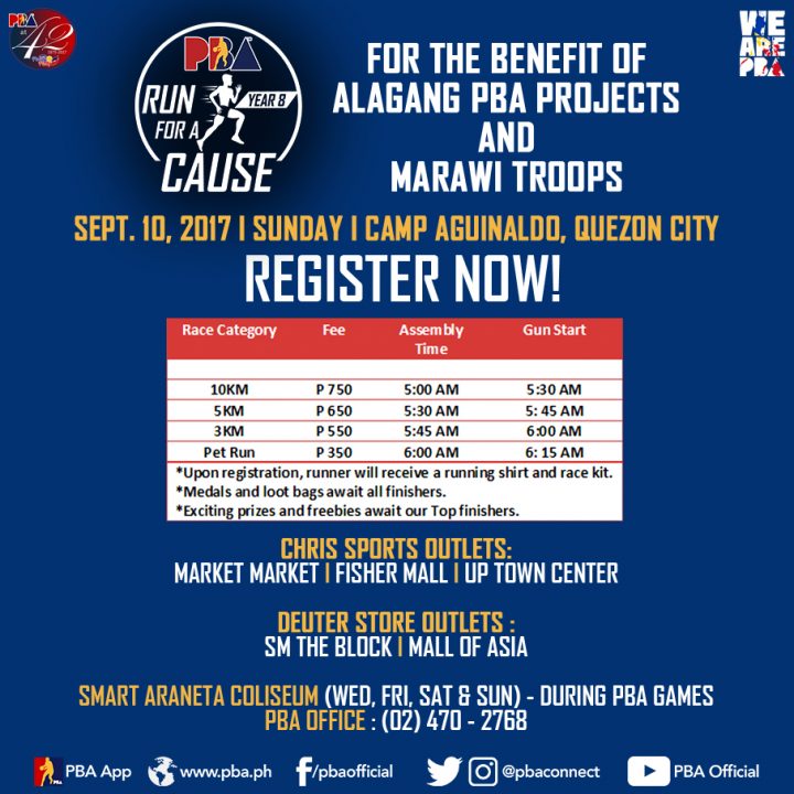 PBA Run for a Cause Year 8 2017 will be on September 10, 2017 at Camp Aguinaldo, QC.