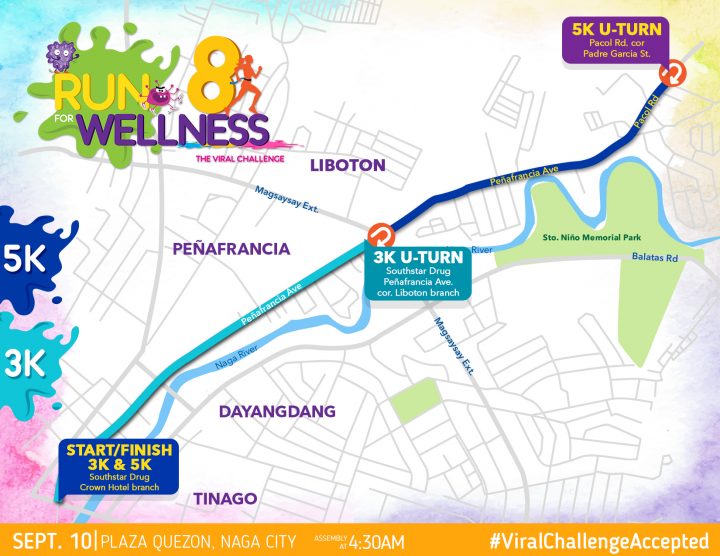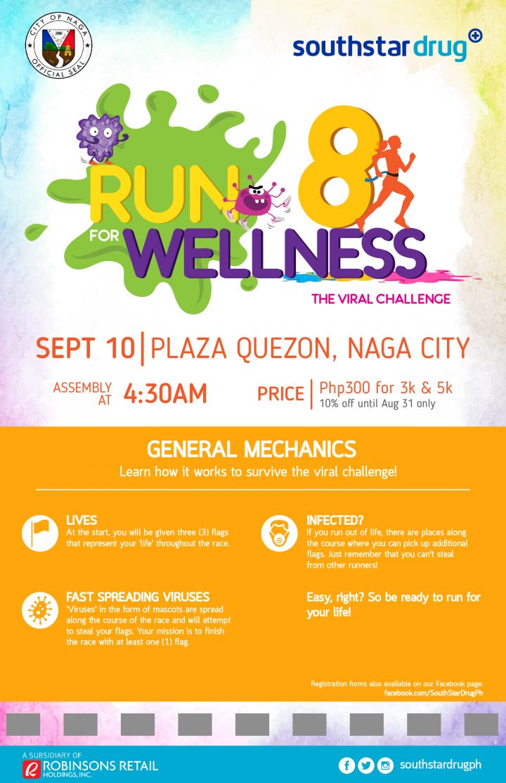 Register for 3k or 5k in select Southstar Drug branches in Bicol and get 10% off until August 31, 2017. Run for Wellness 8 will be held at Plaza Quezon in Naga City on September 10.