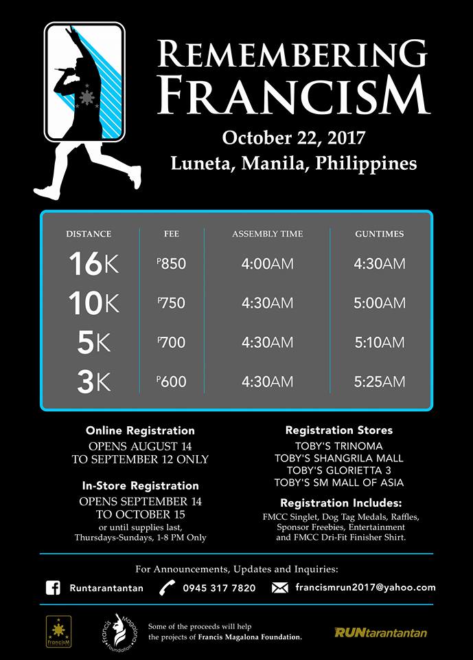 Remember Francis Magalona? Join the Remembering FrancisM Run happening on October 22, 2017 in Luneta Park! Featuring a 3K, 5K, 10K and 16K race distance. The event is organized by RUNtarantantan.