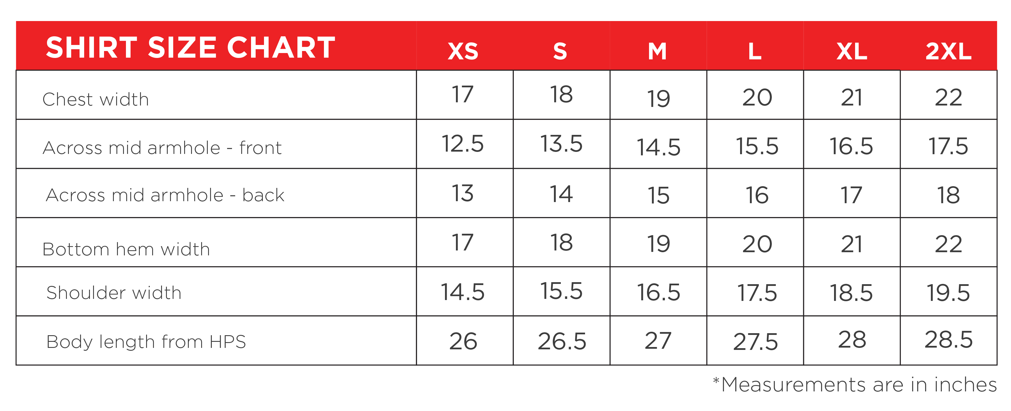 PF SUB1 2018 Shirt Size Chart