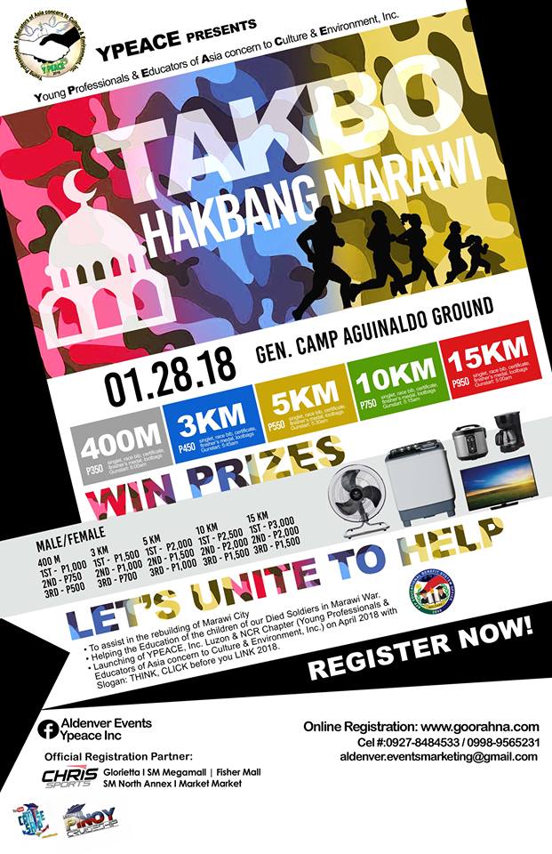 In response to this dilemma, The YPEACE, Inc., is taking the initiative to raise awareness of this current situation. We invite everyone to join the “YPEACE RUN FOR A CAUSE” TAKBO: HAKBANG MARAWI 2018” to be conducted this 28th day of January 2018 (Sunday) in the Camp Aguinaldo grounds.