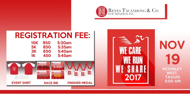 Reyes Tacandong & Co. Foundation Inc. (RTCFI), a non-stock, non-profit organization committed to provide healthcare, educational access and livelihood projects to poor communities will be holding its first Fun Run Event entitled on November 19, 2017 “We Care, We Run, We Share” at McKinley West, Taguig.
