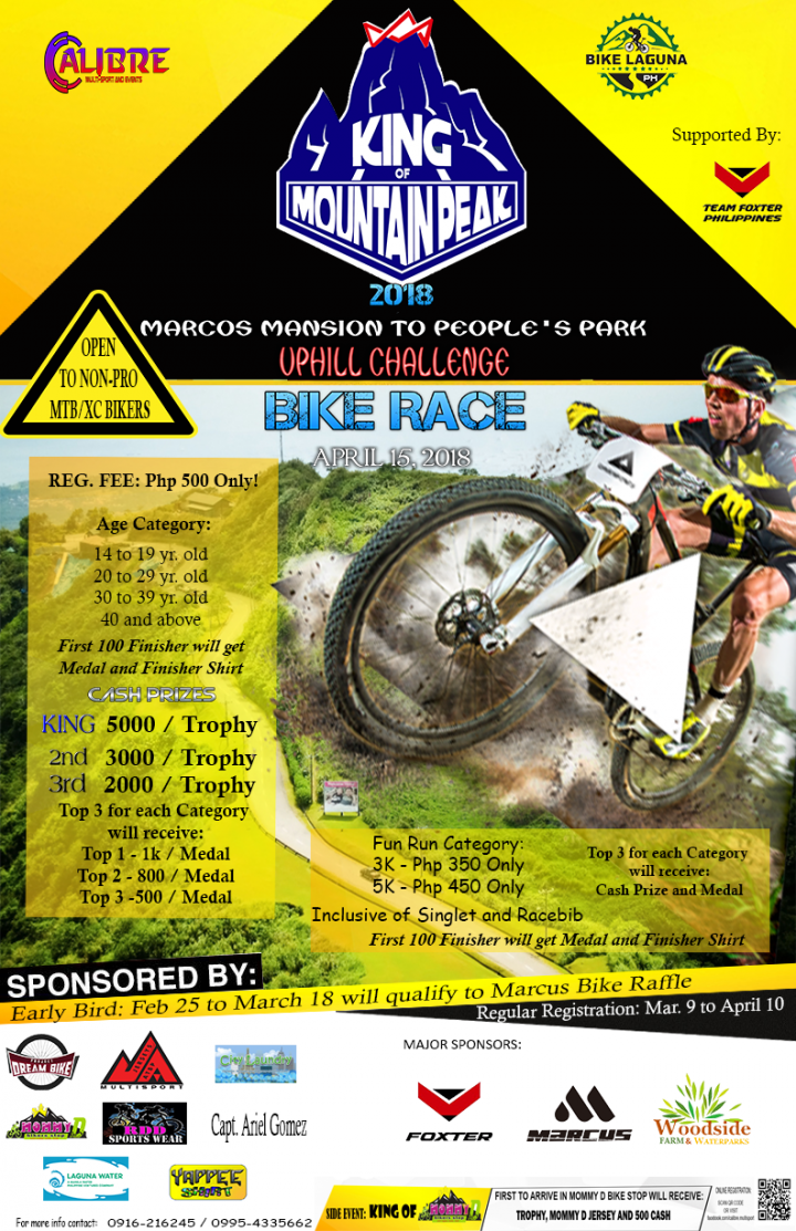 Do you have what it takes to be the first King of the Mountain Peak? The event is happening on April 15, 2018 with a 10km uphill ride from Marcos Mansion to Palace in the Sky. The race is open to all NON-PROFESSIONAL MTB/XC bikers from ages 14-18/19-29/30-39/40 and above.