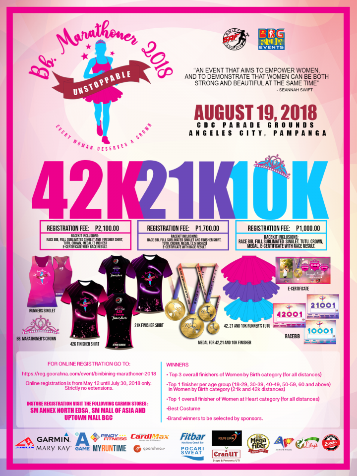 Binibining Marathoner 2018 is the first ever all-women race in the Philippines that features multiple distance categories — the 42K main event, as well as a 21K and a 10K race.