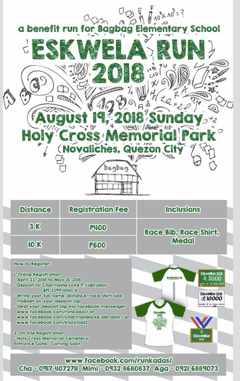 EskwelaRun is a benefit run for the Bagbag Elementary School. This event is happening on August 19, 2018 at the Holy Cross Memorial Park, Novaliches, Quezon City!