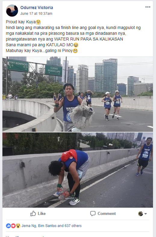 According to Jonathan Garcia, one of our Community members, the runner took the initiative to do this upon seeing that not all runners were able to throw away the used paper cups properly. And from picking paper cups, he began picking litters along the way too.