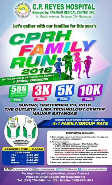 C. P. REYES HOSPITAL Managed by Tanauan Medical Center, Inc. is celebrating its 35th ANNIVERSARY. We are aiming to gather families in an exciting event for this year’s CPRH FAMILY RUN for a CAUSE. This is for the benefit of all Healthcare centers in Malvar Batangas.