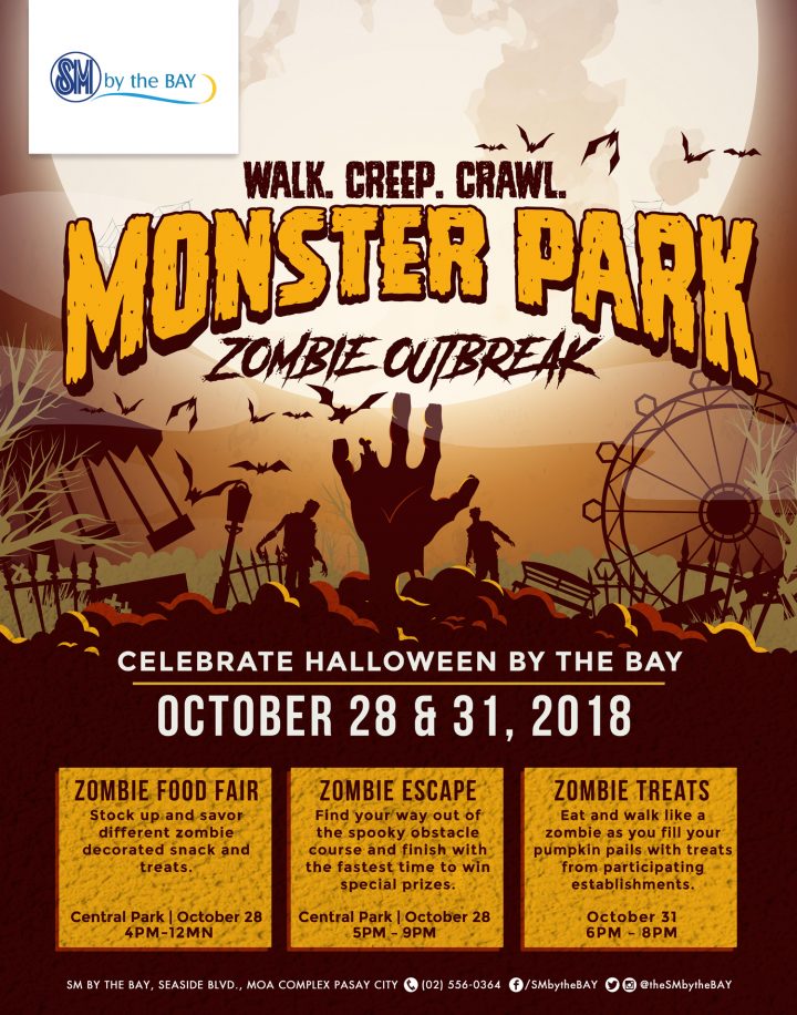 Walk, Creep, Crawl! Celebrate Halloween by The Bay on October 26 and 31, 2018. Stock up and savor different zombie decorated snack and treats at the Zombie Food Fair, find your way out of the spooky obstacle course and finish with the fastest time and win special prizes at the Zombie Escape, and eat and walk like zombies as you fill your pumpkin pails with treats from participating establishments.