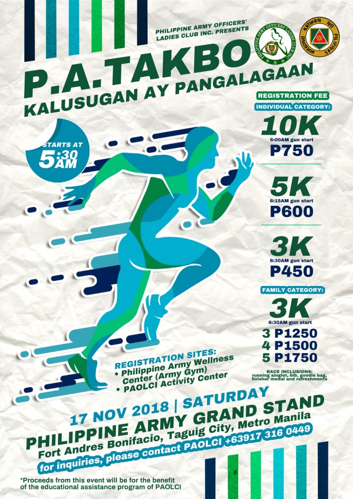 Run in the military’s shoes and explore the Fort Bonifacio Camp this November 17 at the Philippine Army Grandstand! This event is to raise funds for the educational assistance of Army dependents.