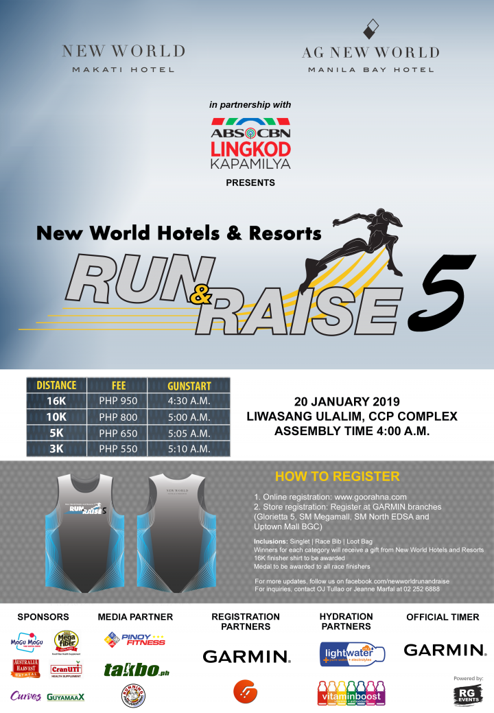 New World Hotels and Resorts’ annual charity fun run, Run and Raise, is on its 5th year. Join us as we lace up and race to raise funds for the children of ABS CBN Lingkod Kapamilya Foundation Inc. – Bantay Bata 163.