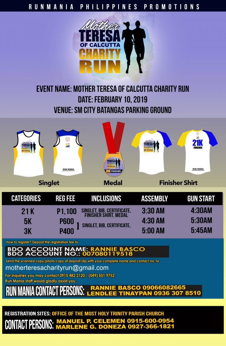 Run Mania Philippines Promotions Co.–one of the leading running events organizers in the country, in collaboration with Most Holy Trinity Parish Pastoral Council, will be conducting a benefit fun run entitled Mother Teresa of Calcutta Charity Run with the theme “Year of the Youth” on February 10, 2019 from 4:00AM to 9:00AM.