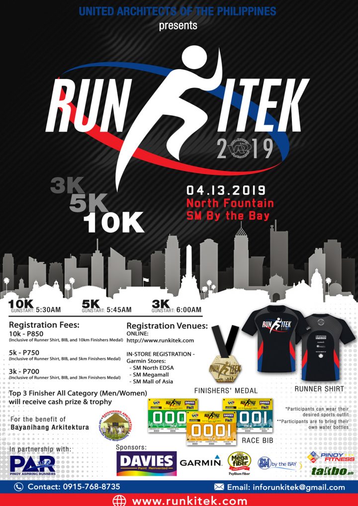 As part of the prestige celebration of the 45th UAP National Convention, the United Architects of the Philippines (UAP) in collaboration with Pinoy Aspiring Runners Inc. (PAR) presents to you the very first RUNKITEK 2019! This run for a cause is set to kick-off on April 13, 2019 at the SM By the Bay, Mall of Asia Complex, Pasay City.
