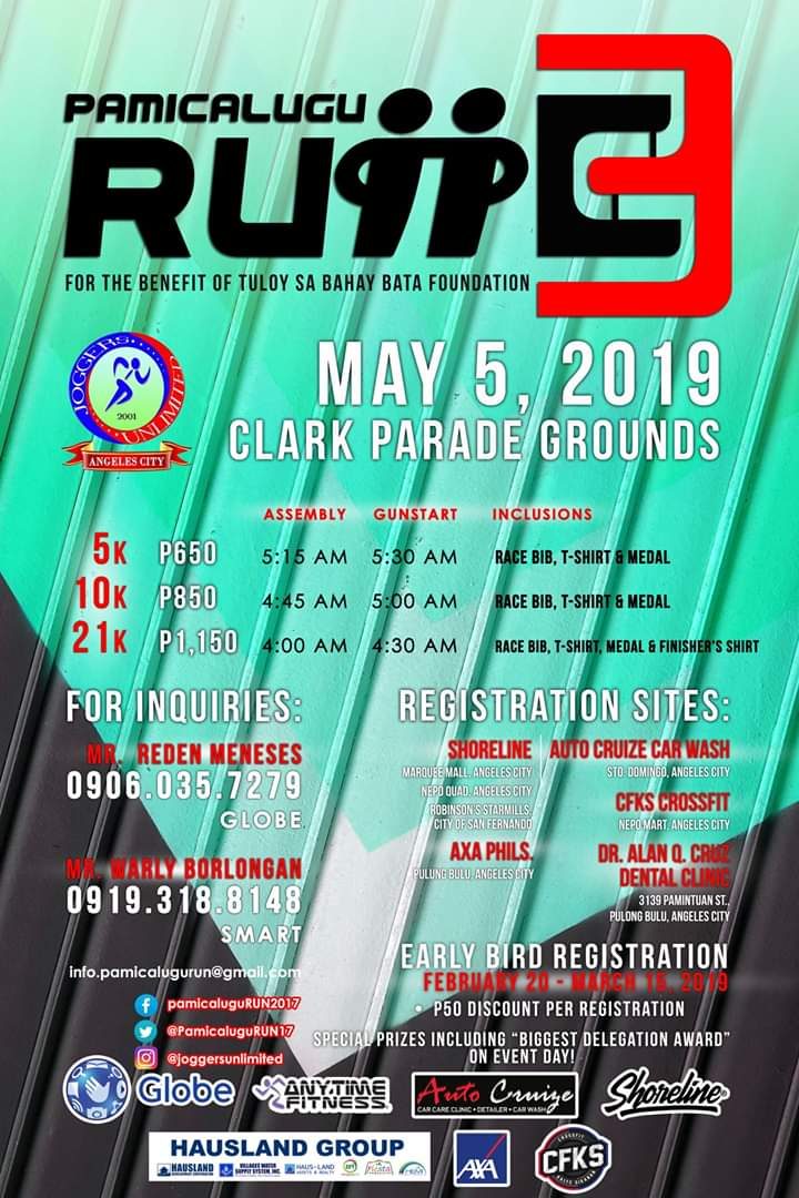 PamicaluguRUN is an annual fun run organized by the Angeles City-based running organization, Joggers Unlimited. This event is for the benefit of Tuloy sa Bahay Bata Foundation and other charitable endeavors.