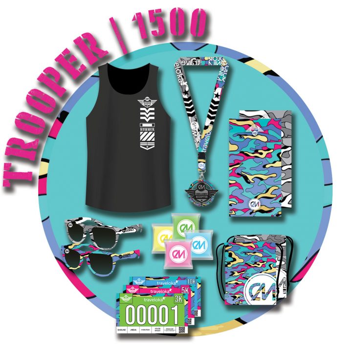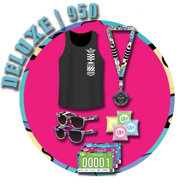 – Event Shirt, Race Bib, Finisher’s Medal, Sunglasses, Drawstring Bag, Headwear, Color Packet