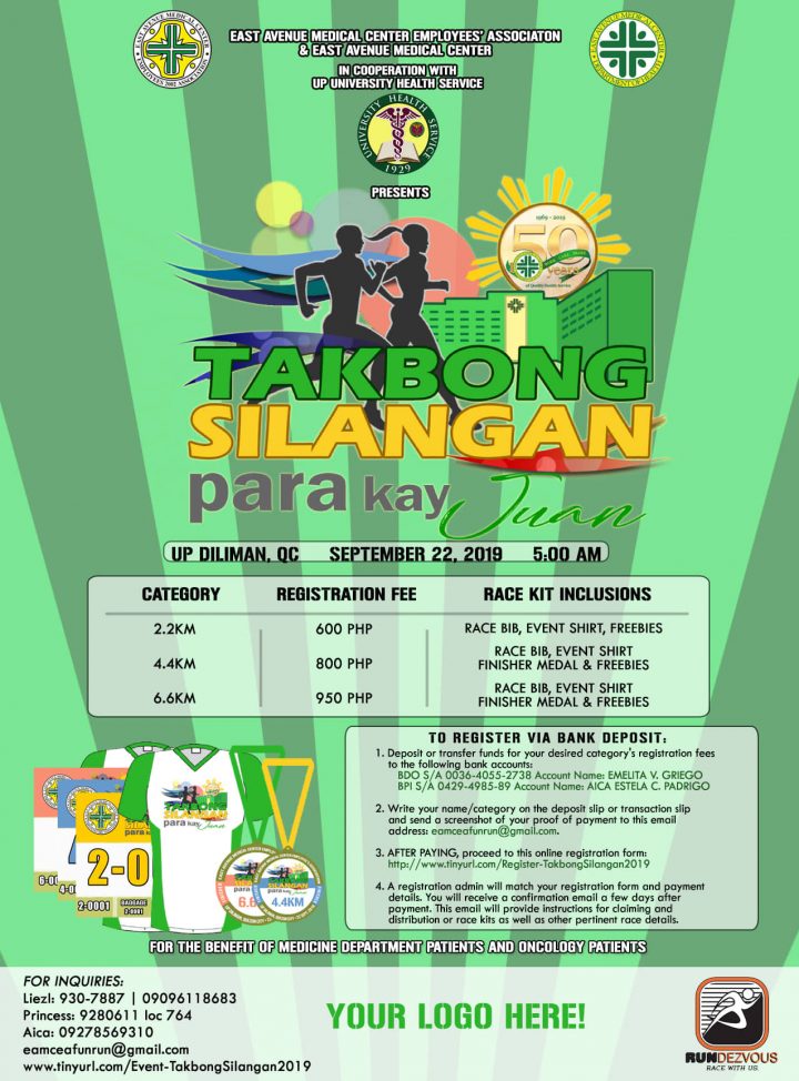 In celebration of 50 years of quality health service, the Employees Association of a premier medical training institute, EAST AVENUE MEDICAL CENTER, was emboldened to offer to its constituents composed of healthcare workers and medical staffs, a celebration of their inspiring work for Pinoys by staging a fun run on September 22, 2019 at the Sunken Garden of UP Diliman, QC.