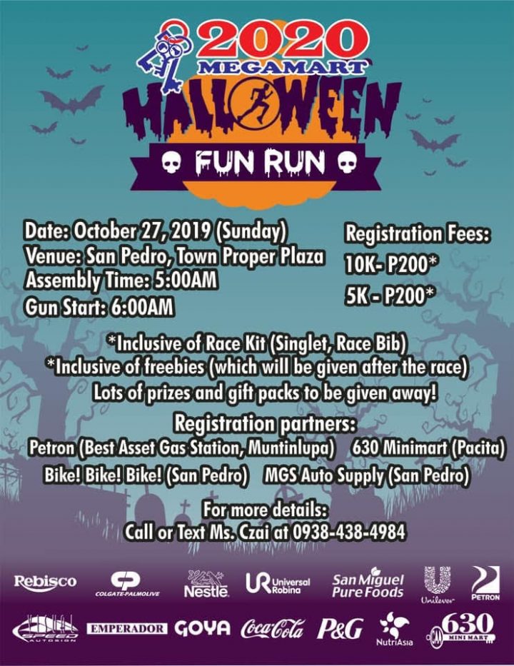 2020 Megamart first halloween fun run is happening on October 27,2019. Run wearing your favorite Halloween costumes.