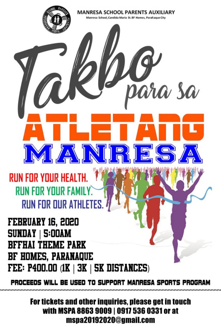 On February 16, 2020, Sunday we will hold a Family Fun Run tagged as “Takbo Para sa Atletang Manresa” at BFFHAI Theme Park, BF Homes Paranaque City. Gun start will be at 5am. Proceeds from this activity will support the sports program of the school and provide additional funds to cover the incidental needs of our athletes.