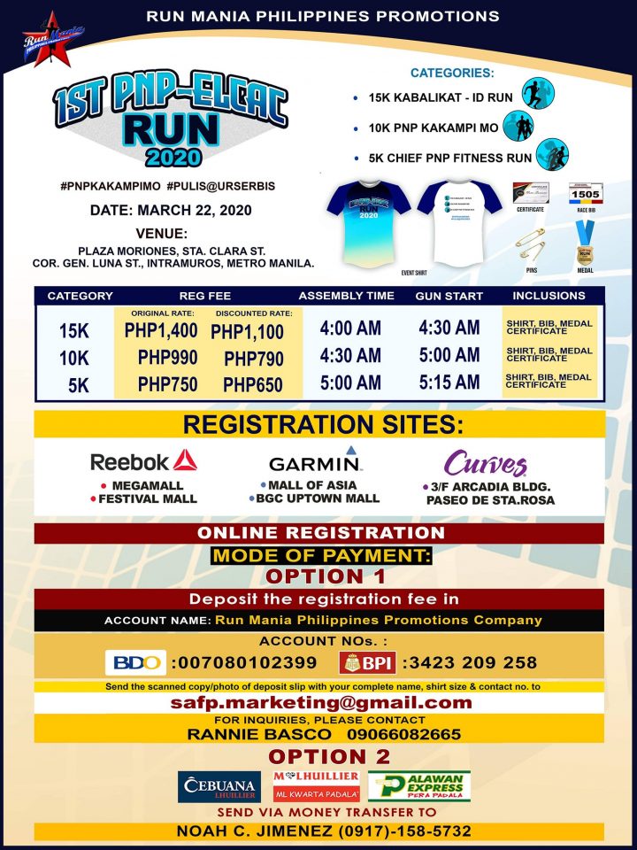 In pursuit of connecting our uniformed personnel to the society through different community services, promoting awareness about KABALIKAT-ID (Kalipunan ng Bayang may Layuning Iwaksi ang Karahasan, Terorismo at Iligal na Droga), and intensifying the campaign for a drug-free country; PCADG—also known as Police Community Affairs and Development Group will be conducting a running event entitled 1ST PNP-ELCAC RUN on March 22, 2020 at Fort Santiago grounds, Intramuros that aims to raise funds for the following: