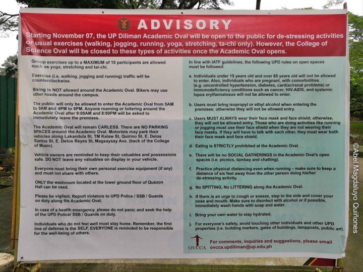 Starting November 7, the UP Academic Oval will once again be open to the public for de-stressing activities like (walking, jogging, running, yoga, stretching and taichi). But here are a few guidelines to take note of: