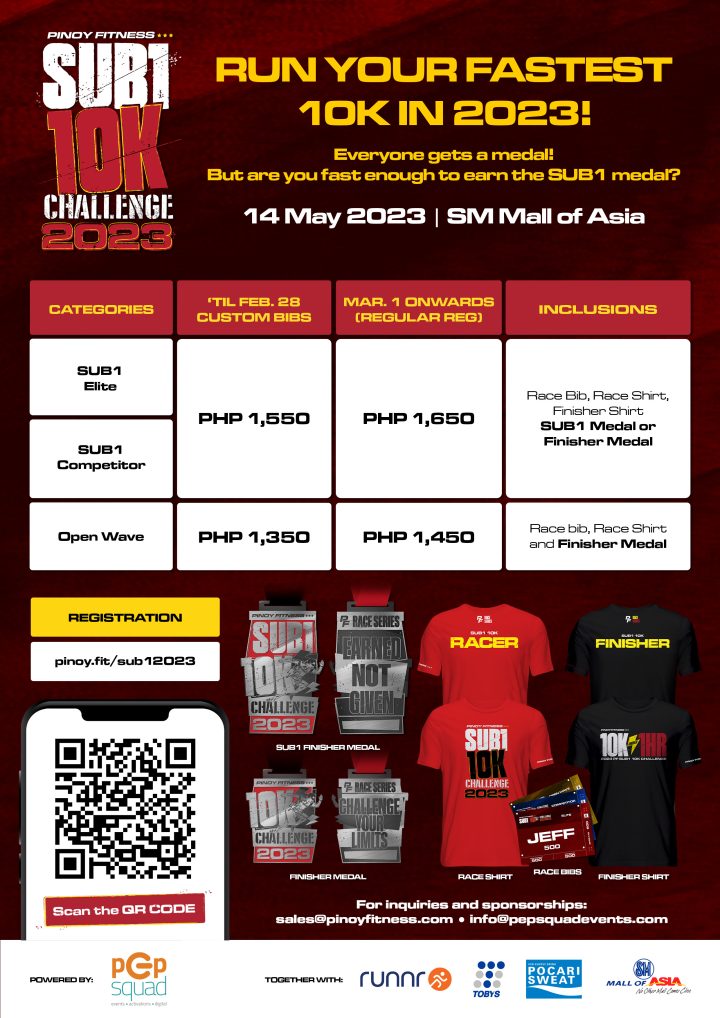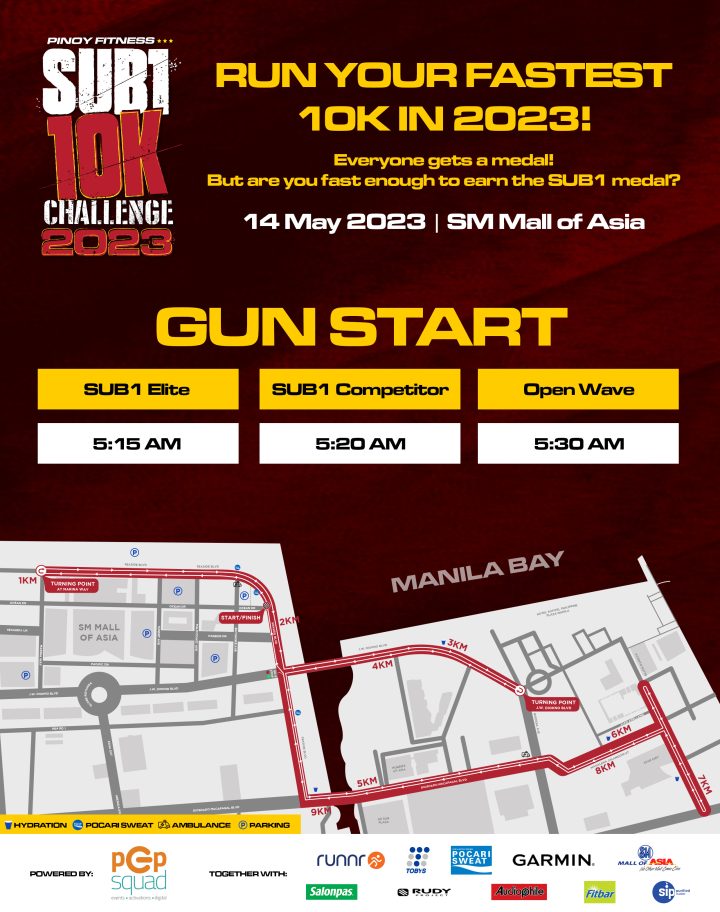 The Pinoy Fitness SUB1 10K Challenge is returning and inviting all runners to join us for our 11th year. Set to take place on May 14, 2023 at SM Mall of Asia, this exciting race is designed to help you achieve your personal best 10K time. Every participant will receive a 10K medal, but if you’re fast enough to complete the race in one hour or less, you’ll earn the coveted PF SUB1 finisher medal. Don’t miss your chance to challenge yourself and experience the thrill of this unique event.
