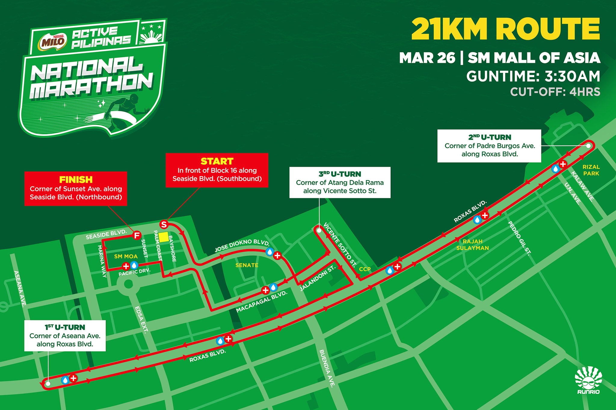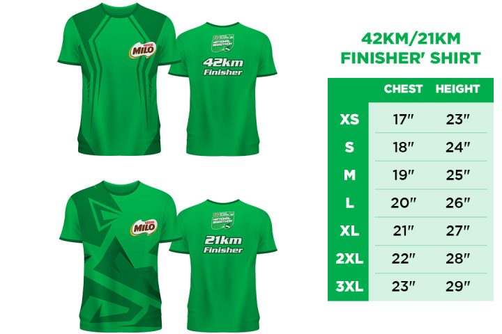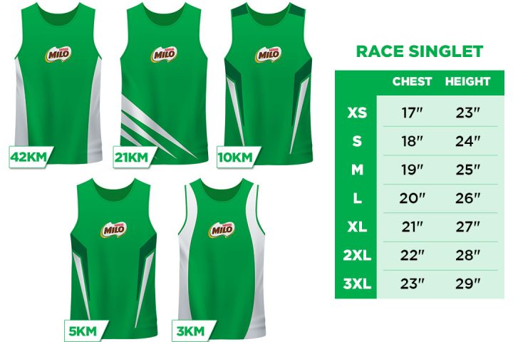 – 21K and 42K – Includes Singlet, Race Bib, Drawstring Bag with MILO Packs, Finisher’s Shirt, Medal, Certificate, and Loot bag