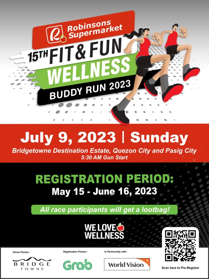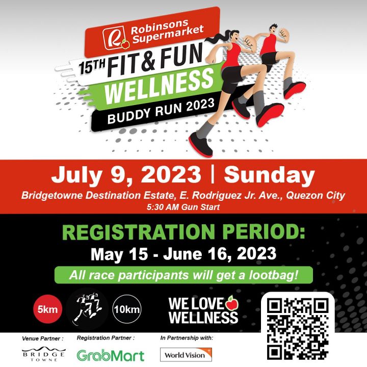 Robinsons Supermarket’s annual fun run, in partnership with World Vision, is gearing up to celebrate its 15th year. The Fit&Fun Wellness Buddy Run, traditionally held in July to coincide with nutrition month, will take place on July 9, 2023, at Bridgetowne Destination Estate, E. Rodriguez Jr. Ave, Quezon City.