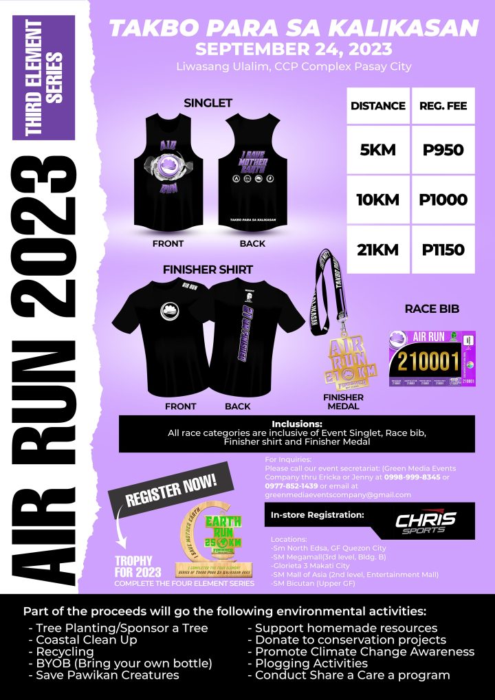The 5th year of AIR RUN, the 3rd element series of Takbo Para Sa Kalikasan (Fire, Water, Air, and Earth Run), is being organized by Green Media Events Company. Despite the challenges posed by the pandemic and the current situation, the event aims to encourage the public to participate in environmental conservation amidst the drastic impacts of global warming.