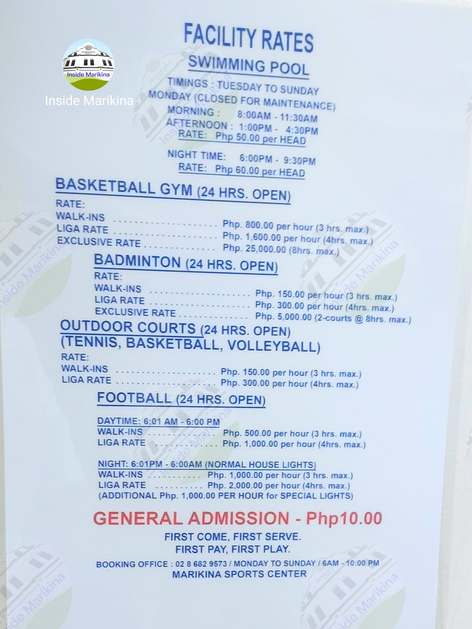 The booking office is open from 6am to 10pm and is located at Gate 2 (McDo side). For further questions or inquiries, you may reach MSP/MSC at their Facebook page: Marikina Sports Center or via landline at 2868.29573.