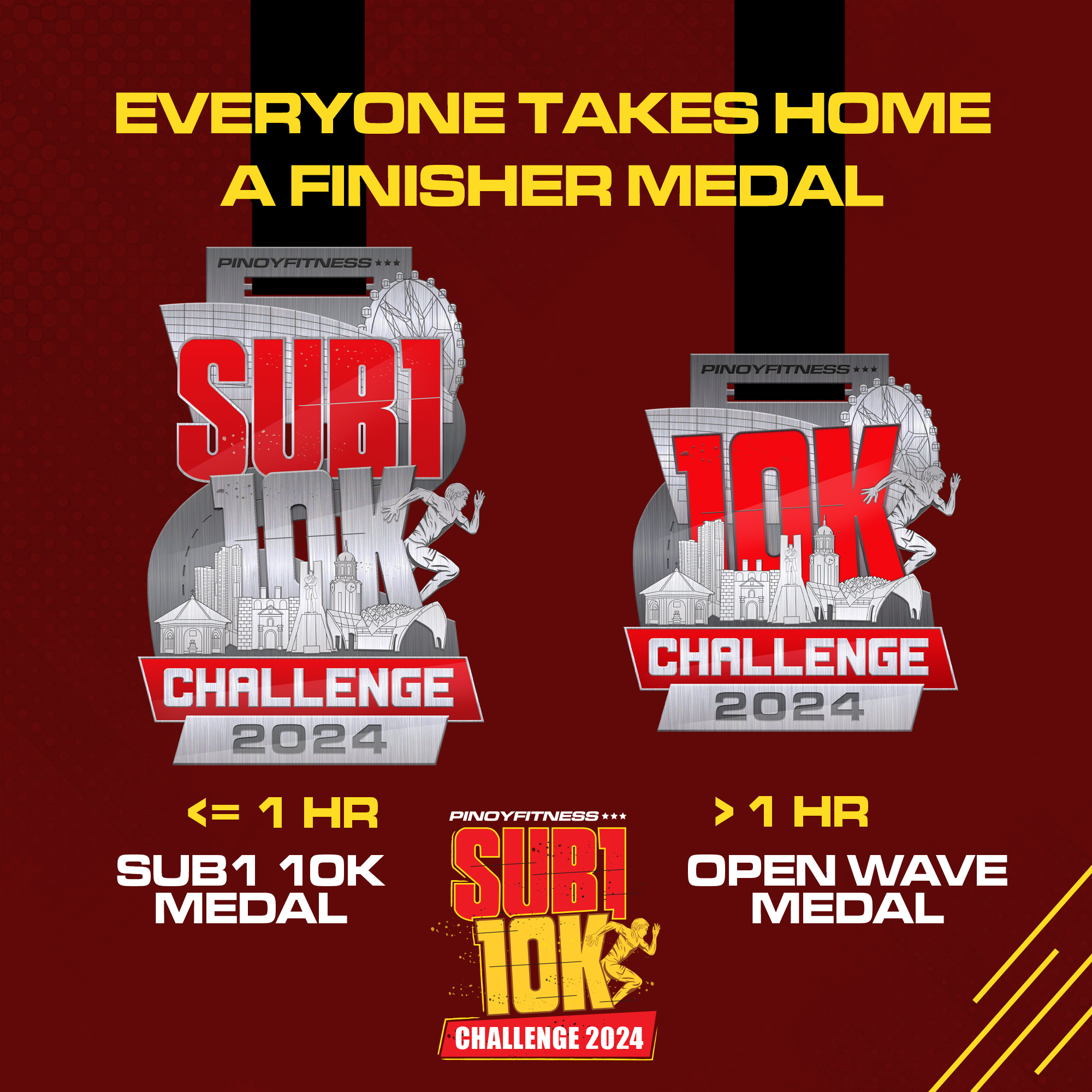 – Runners who complete the SUB1 HOUR challenge will get the SUB1 10K Medal, after the 1 HOUR cutoff, runners will receive the 10K Challenge Medal