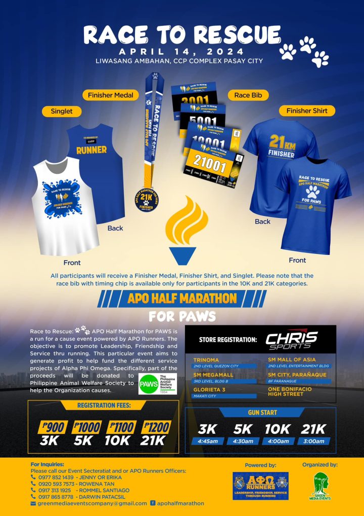 Join the Race to Rescue: APO Half Marathon for PAWS on April 14, 2024, at Liwasang Ambahan, CCP Complex, Pasay City. This event, powered by APO Runners, is not just a race but a mission to promote Leadership, Friendship, and Service through Running. With distances of 3k, 5k, 10k, and 21k, runners of all levels can participate and make a difference.