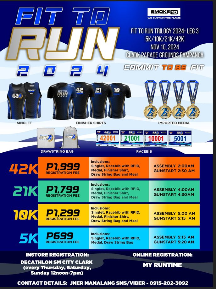 Join the final leg of the FIT TO RUN TRILOGY 2024 on November 10, 2024, at the iconic Clark Parade Grounds in Pampanga. This highly anticipated event, organized by Smoke10 Events Management, offers a variety of distances including 5K, 10K, 21K, and a full 42K marathon. It’s the perfect opportunity to test your limits, whether you’re a seasoned runner or a beginner.