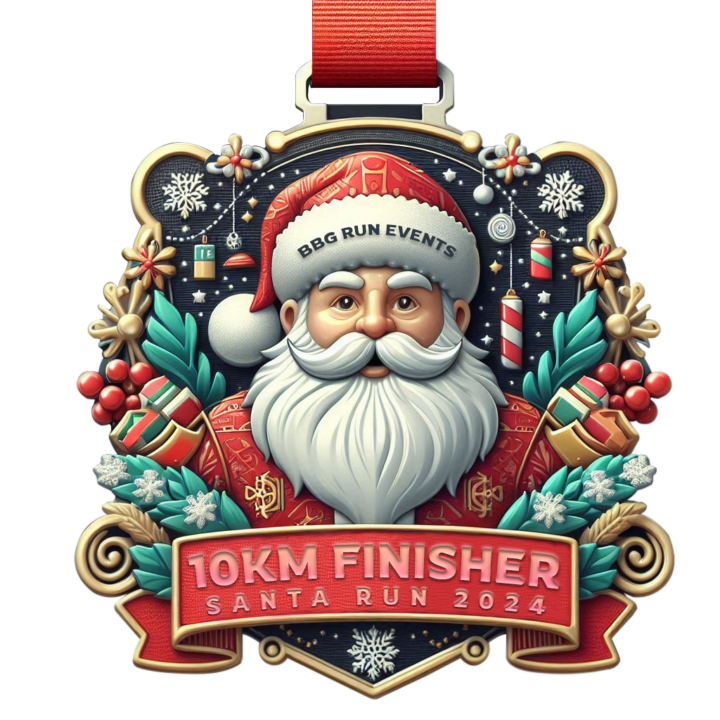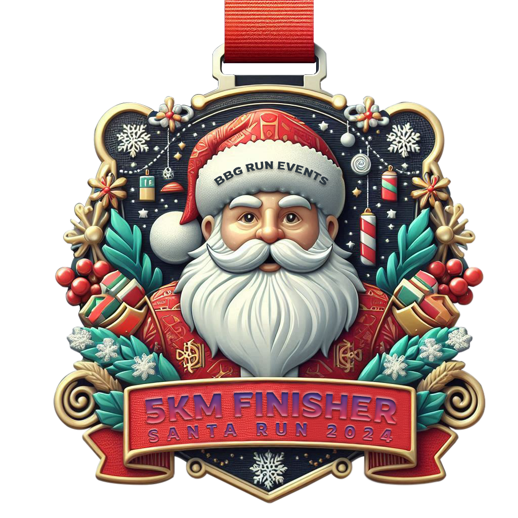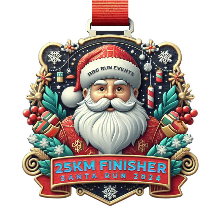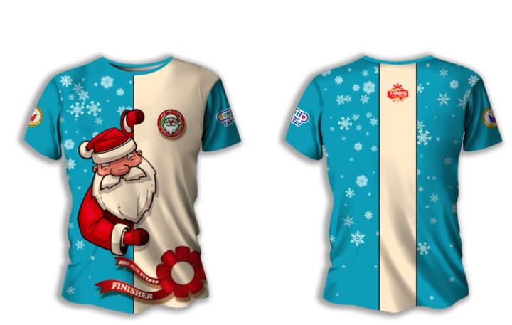 Participants will receive vibrant event shirts and finisher shirts featuring holiday designs, along with a uniquely crafted Santa-themed medal.